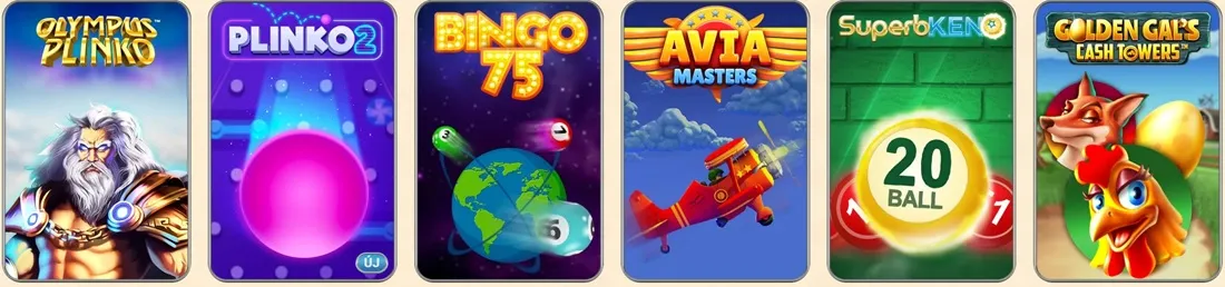 Gyors iramú játékmenetet kínálnak rövid körökkel és szinte azonnali kifizetésekkel. Az ilyen játékok plinkón, összeomláson és más egyedi mechanikán alapulnak, amelyeket itt nézhet meg: